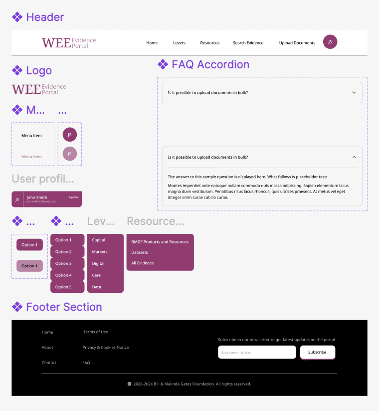 Disclaimer: The extent of the design system displayed here are within the limits of responsible disclosure. The colours and certain elements of the design have been changed so as to not infringe upon the IP of Gates Foundation.